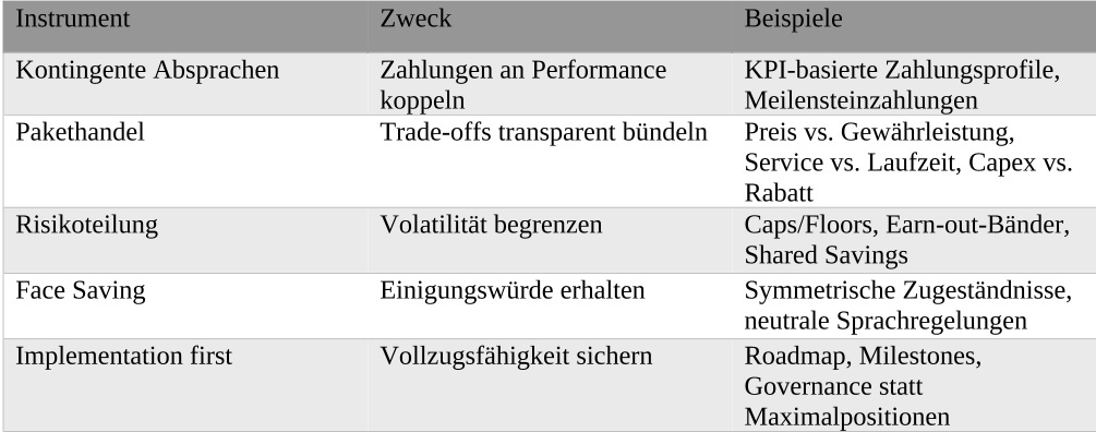 Am Ende steht kein binärer „Sieg“, sondern ein Ergebnisdesign: Paketlösungen aus Preis, Service Levels, Earn‑outs, Sicherheiten und Governance-Regeln. So entsteht ein Deal, der den wirtschaftlichen Kern adressiert – und gleichzeitig vollzugsfähig bleibt.